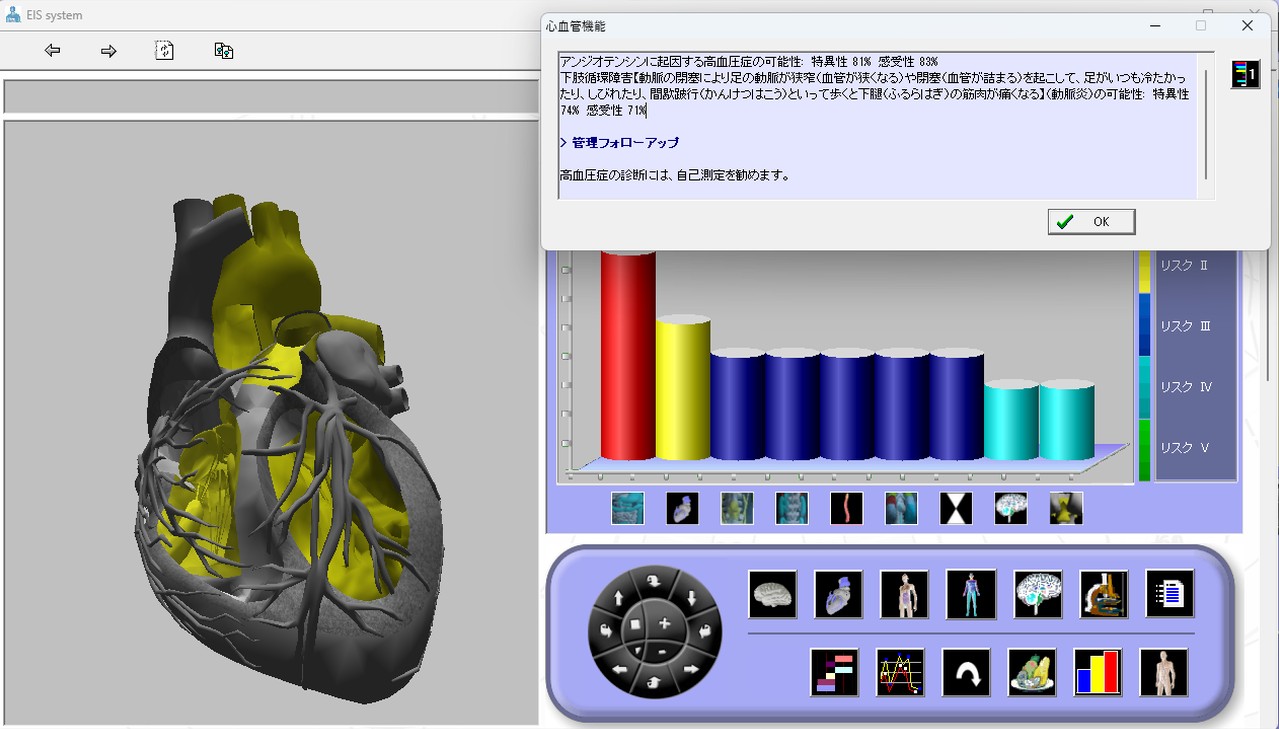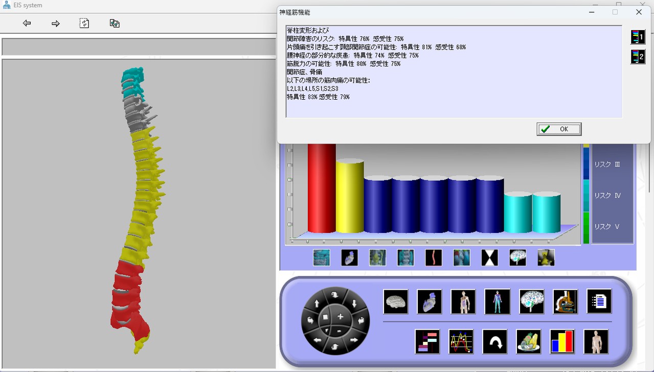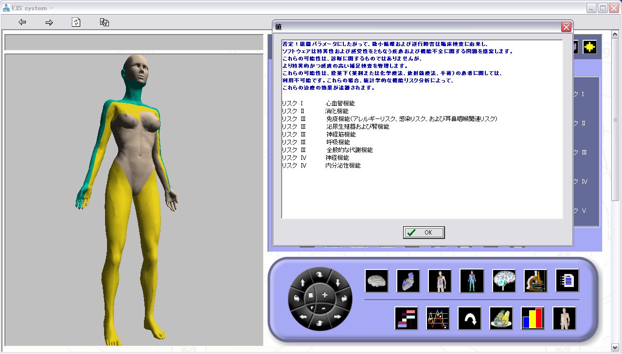 EISは、約3分間測定して得られた生体電流インピーダンス測定結果を、2万2千人以上の治験データを基に、神経伝達物質(ホルモン系)測定、心臓、内臓全般、泌尿器科、脊髄等の状況の推定を行い、その結果である生化学測定の結果(リスク)を、3D画像でモデリング表示します。それらの情報は全身について様々な視点から測定されたものです。