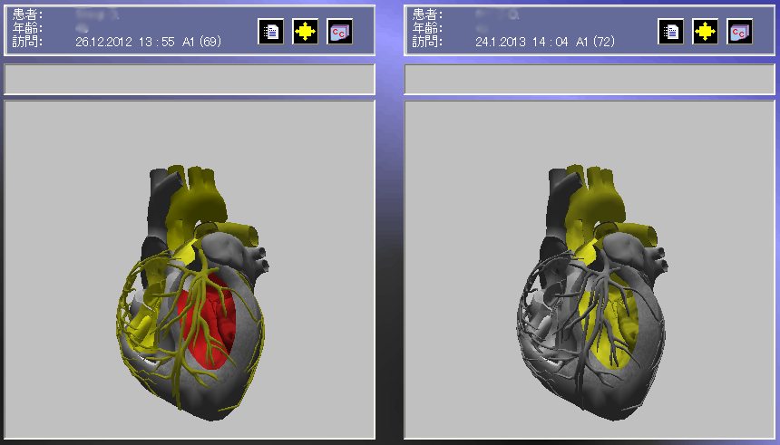カラー表示は、リスクの度合いに応じて色分けして表示されます。気になる部分をフレームアップして確認したいところは、画面上で対象部分をクリックすることで、その部分の状況を、具体的な数値とその数値の正常値との乖離状態を確認することができます